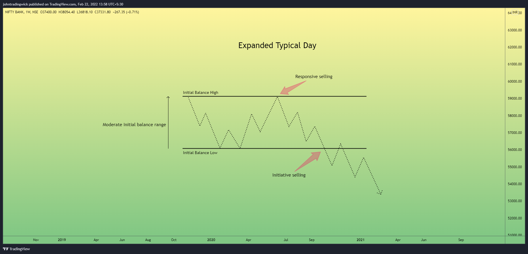 * Eventually, one of the day's extremes is violated, and price movement is seen toward the break, which is usually caused by initiative buying or selling behavior.<br>