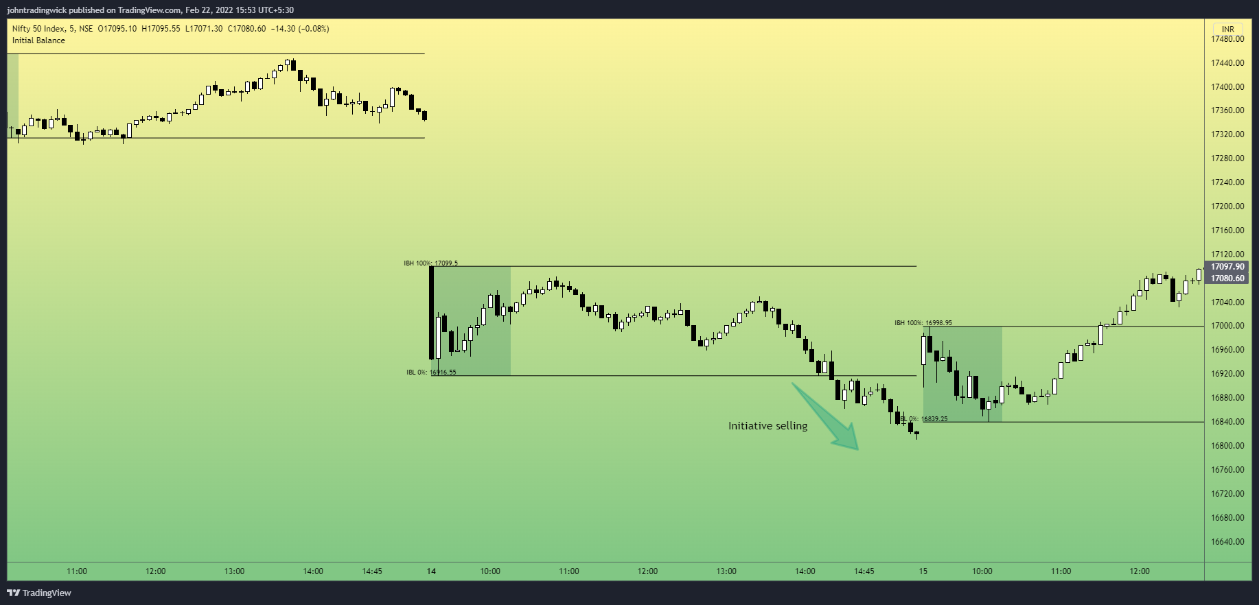 * The initial balance is wider than that of a Double-Distribution Trend Day but not as wide as that of a Typical Day. Hence, it is susceptible to a violation later in the session.<br>